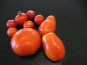 This year, I have the most beautiful tomatoes. They started producing early,  in late spring with the cherry tomato I had nursed through the winter, then the Romas came on and now I have tomatoes from one of the larger varieties. This year they have all been perfect and lots of them.