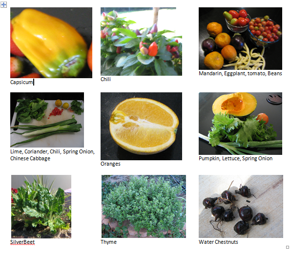 So, the photo below shows the foods which I have been harvesting in this month, although I have forgotten the lemons and limes.  I’ll put them in next months’s photos just so you know.