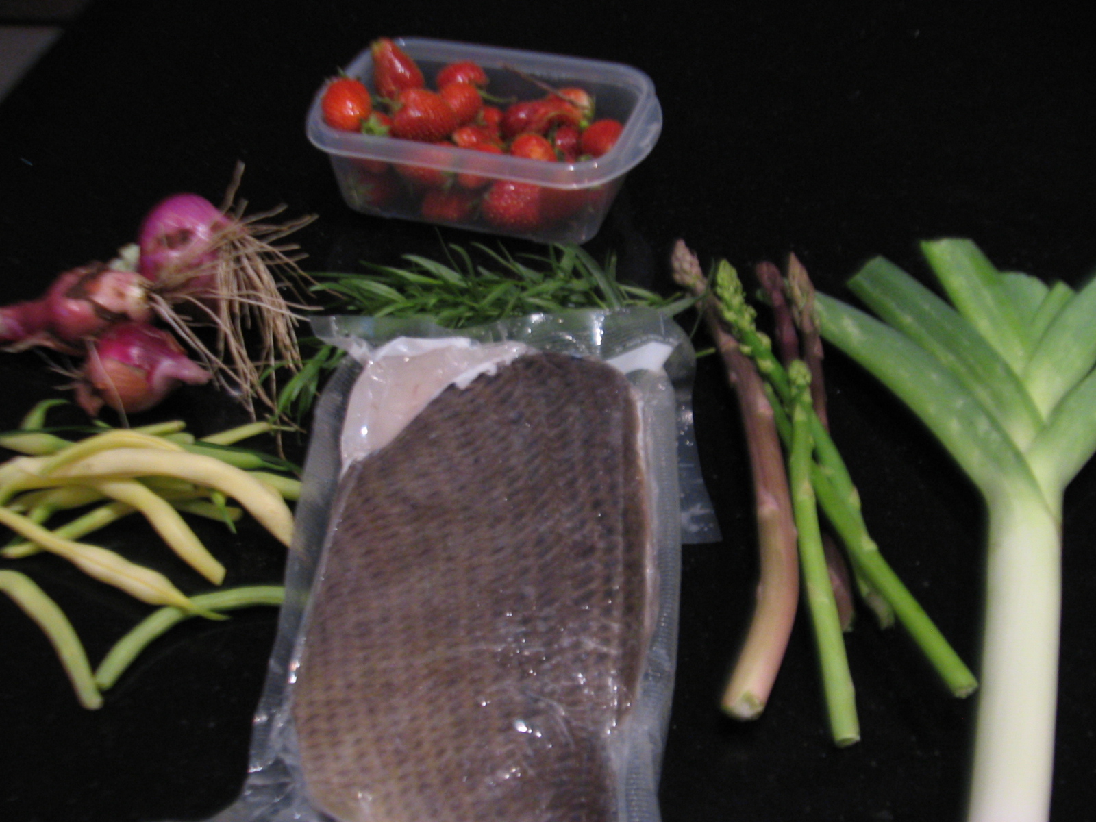 This collection of garden produce above (and the red throat emperor caught by my husband) became Emperor with red onion and tarragon in white wine sauce.